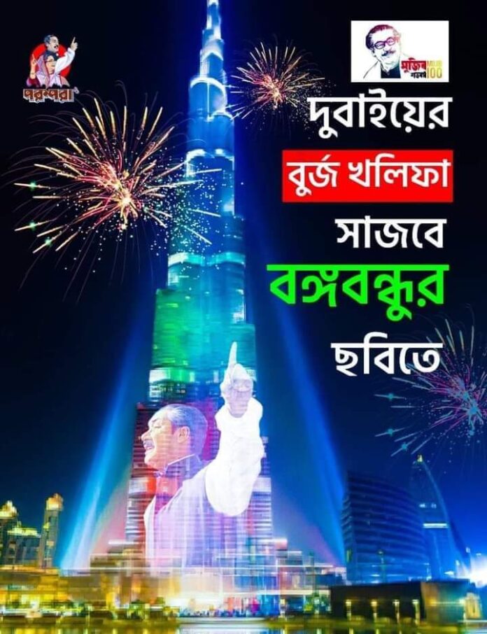 দুবাইয়ে বিশ্ব বিখ্যাত ও সর্বোচ্চ বিল্ডিং টাওয়ার বুর্জ খলিফা এবার আলোকিত হবে বঙ্গবন্ধু শেখ মুজিবুর রহমানের ছবি দিয়ে। মধ্যপ্রাচ্যের অন্যতম ধনী আরব দেশ সংযুক্ত আরব আমিরাত(UAE) জাতির পিতা বঙ্গবন্ধু শেখ মুজিবুর রহমানের জন্মশতবর্ষ উদযাপনের সিদ্ধান্ত নিয়েছে। জানা গেছে, ১৭ মার্চ রাত ৮টা থেকে ৯টা পর্যন্ত দুবাইয়ের বুর্জ খলিফায় বঙ্গবন্ধুর ছবি, জন্মশতবার্ষিকীর লোগো প্রদর্শিত হবে এবং আরবি ও ইংরেজি ভাষায় জন্মশতবর্ষের ঘোষণা দেয়া হবে। একই সঙ্গে আবুধাবির ন্যাশনাল অয়েল কোম্পানির (এডিএনওসি) সদর দপ্তরেও প্রদর্শিত হবে বঙ্গবন্ধুর ছবি। এই বিশাল আয়োজনে আন্তর্জাতিক কমিউনিটিতে দেখা দিয়েছে বেশ আনন্দ ও কৌতুহল। কারন সাম্প্রতিক বিশ্বে বিশেষ করে মধ্যপ্রাচ্যে আরব আমিরাত একটি প্রভাবশালী রাস্ট্র হিসেবে আবির্ভূত হয়েছে। কৌশলগত দিক দিয়ে দেশটি পার্শ্ববর্তী বড় শক্তি সৌদি আরবের অন্যতম মিত্র। তাছাড়া প্রতিবেশী ধনী কাতারের সাথে সম্পর্ক স্বাভাবিক হওয়ায় পুরো উপসাগরীয় অঞ্চলে তার প্রভাব প্রতিপত্তি বৃদ্ধি পেয়েছে। এদিকে দুবাইয়ে বুর্জ আল খলিফায় বঙ্গবন্ধুর ছবি প্রদর্শনের খবরে সেখানকার প্রবাসী বাংলাদেশ কমিউনিটির মাঝে দেখা যাচ্ছে আনন্দ উদ্দীপনা। সাইফুল আজম নামে প্রবাসী এক ব্যবসায়ী কমিউনিটি নেতা অনলাইন ফোনে বলেন, দেশের বাইরে প্রবাসেও বঙ্গবন্ধুর জন্মশতবর্ষ পালনের খবরে আমরা সবাই আনন্দিত। আমরাও এই উৎসবে শরীক হতে পারব। এতে বাংলাদেশের সুনাম বৃদ্ধি পাবে এবং বঙ্গবন্ধু যে একজন আন্তর্জাতিক পর্যায়ের নেতা ছিলেন তা সুস্পষ্ট হয়ে উঠবে। সারা বিশ্বে বাঙ্গালী কমিউনিটির সম্মান ও মর্যাদা বাড়বে। কারন দুবাই একটি আন্তর্জাতিক কানেক্টিভিটি কেন্দ্র।