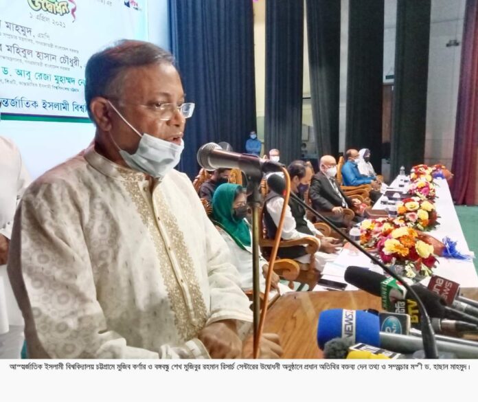 স্বাধীনতার সুবর্ণজয়ন্তীতে আন্তর্জাতিক ইসলামি বিশ্ববিদ্যালয় চট্টগ্রাম (আইআইইউসি)এ মুজিব কর্নার ও বঙ্গবন্ধু শেখ মুজিবুর রহমান রিসার্চ সেন্টার ফর ইসলাম এন্ড ইন্টাররিলিজিয়াস ডায়ালগ (বিআরসিআইআইডি) উদ্বোধন করা হয়েছে। বৃহস্পতিবার (৩১ মার্চ) সন্ধ্যায় চট্টগ্রামে এই উদ্বোধন অনুষ্ঠানে প্রধান অতিথির বক্তব্যে তথ্য ও সম্প্রচার মন্ত্রী ড. হাছান মাহমুদ বলেন, ব্রাহ্মণবাড়িয়াসহ দেশের বিভিন্নস্থানে যে তাণ্ডব চালানো হয়েছে, সেটি একটি সংগঠনের ব্যানারে হলেও সেটির সাথে যুক্ত হয়েছিল বিএনপি এবং জামায়াত। তারা মিলে এই ঘটনাগুলো ঘটিয়েছে। ব্রাহ্মণবাড়িয়ার তান্ডব ইসলামের উপর কালিমা লেপন করেছে। মন্ত্রী বলেন, তারা স্বপ্ন দেখে বাংলাদেশকে আফগানিস্তান বানানোর জন্য। ভারতের প্রধানমন্ত্রী নরেন্দ্র মোদির আগমন অজুহাত হিসেবে দাঁড় করিয়েছিল মাত্র। ইসলাম কখনো এগুলো সমর্থন করে না, এই অপশক্তিকে রুখতে হবে। আন্তর্জাতিক ইসলামী বিশ্ববিদ্যালয় চট্টগ্রামের বোর্ড অব ট্রাস্টির চেয়ারম্যান প্রফেসর ড. আবু রেজা মুহাম্মদ নেজামুদ্দিন নদভী এমপি’র সভাপতিত্বে অনুষ্ঠানে প্রধান বক্তা ছিলেন শিক্ষা উপমন্ত্রী ব্যারিস্টার মহিবুল হাসান চৌধুরী। অনুষ্ঠানে বিশেষ অতিথির বক্তব্য দেন খাদিজাতুল আনোয়ার সনি এমপি, উপাচার্য অধ্যাপক আনোয়ারুল আজিম আরিফ, ট্রাস্টি বোর্ডের সদস্য রিজিয়া রেজা চৌধুরী, ইসলামি আরবী বিশ্ববিদ্যালয়ের ভিসি আহসান উল্লাহ, প্রফেসর ড. ছালেহ জহুর, শাহরিয়ার জাহান প্রমূখ।