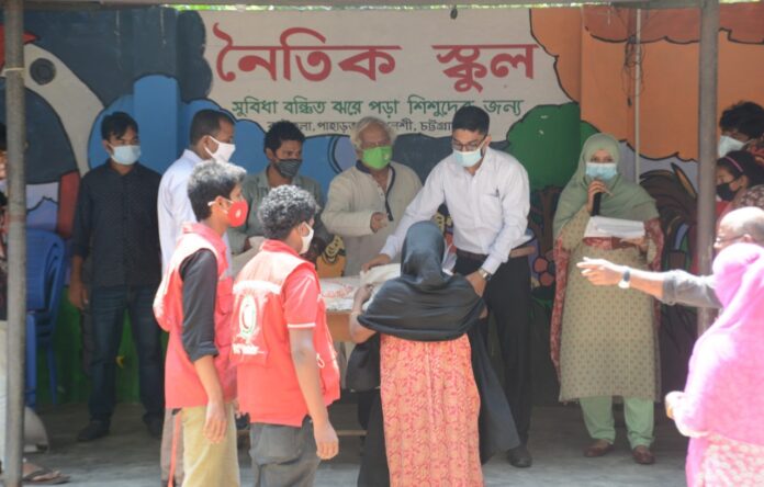 প্রতিটি স্কুলেই নৈতিকতা ও মানবিকতা শেখানো হয়। কিন্তু সমাজের কিছু পশ্চাৎপদ  জনগোষ্ঠীর ছেলেমেয়েরা  সে সব  স্কুলের আঙ্গিনা থেকে রয়ে যায় অনেক দূরে। দিনে আনা দিনে  খেটে খাওয়া মানুষ, কুলি আর  দিনমজুর  সন্তানদের লেখাপড়া করানোর সময় এই ব্যস্থ  সমাজের নেই। কে তাদের শেখাবে লেখাপড়া, নৈতিকতা, সততা আর মানবিকতা? কিন্তু প্রকৃতি যেন  তার সন্তানদের কাউকে বঞ্চিত করতে চায় না। কারো না কারো উদ্যোগে ও  উছিলায় গড়ে উঠে মানবিক সমাজ। পৃথিবীর এই পাঠশালায় কেউ না কেউ এগিয়ে আসে। অবহেলিত ও সুবিধাবঞ্চিত মানুষের সেবায়  কিছু করার জন্য  কিছু বিবেকবান  মানুষও এ সমাজে আছে। তেমনি একজন বিবেকবান মানুষের নাম প্রফেসর ড. গাজী সালাউদ্দিন। একপ্রকার নীরবে নিভৃতেই তিনি সমাজের পশ্চাৎপদ জনগোষ্ঠীর শিশু কিশোরদের শিক্ষা ও নৈতিকতা পাঠদানের জন্য গড়ে তুলেছেন ‘ নৈতিক স্কুল ‘। চট্টগ্রাম শহরের খুলশীতে গেলেই দেখা মেলে তাঁর সেই মানবিক স্কুলের। নগরীর ধনী আর অভিজাত শ্রেনীর মানুষের সারি সারি  বিলাসবহুল অট্টালিকা সমৃদ্ধ  এই এলাকারই এক জায়গায়  যে একজন শিক্ষাবিদ, পথশিশু ও দিনমজুরের সন্তানদের মাঝে শিক্ষার আলো বিলিয়ে যাচ্ছেন তা অনেকেই জানেন না। কিন্তু করোনা দূর্যোগের এই দুঃসময়ে দুস্থদের এই পাঠশালায়  ঠিকই প্রয়োজনীয় সাহায্য পৌঁছে দিতে পেরেছেন  চট্টগ্রামের জেলা প্রশাসক ও জেলা ম্যাজিস্ট্রেট  মোঃ মমিনুর রহমান। সোমবার ( ২৬ এপ্রিল)জেলা প্রশাসকের  নির্দেশে সহকারী কমিশনার ও এক্সিকিউটিভ ম্যাজিস্ট্রেট মো: উমর ফারুকের তত্ত্বাবধানে নগরীর নৈতিক স্কুলে ১১০জন সুবিধাবঞ্চিত শিশুদের হাতে মাননীয় প্রধানমন্ত্রীর উপহার পৌঁছে দেয়া হয়। এসময় ত্রাণ কার্যক্রমে জেলা প্রশাসনের পক্ষ থেকে উপস্থিত ছিলেন সহকারী কমিশনার ও এক্সিকিউটিভ ম্যাজিস্ট্রেট  সোনিয়া হক এবং প্রতীক দত্ত। এসময় উপস্থিত ছিলেন চট্টগ্রাম বিশ্ববিদ্যালয়ের সমাজতত্ত্ব বিভাগের সাবেক প্রফেসর  নৈতিক স্কুলের প্রতিষ্ঠাতা প্রফেসর ডঃ গাজী সালাউদ্দিন। এই বিষয়ে জানতে চাইলে তিনি সবাইকে ধন্যবাদ জানিয়ে বলেন, সীমিত পরিসরে সাধ্যমত চেষ্টায় ২০১৫ সালে এই স্কুল প্রতিষ্ঠা হয়।  বিকাল ৩টা থেকে ৬টা এখানে অবহেলিত  পথশিশু, দিনমজুর, ঘরের আয়া ও বুয়ার সন্তানদের পাঠদান করা হয়। দীর্ঘদিনের শিক্ষাগত অভিজ্ঞতা থেকে আমি দেখেছি সমাজের একটি পশ্চাৎপদ জনগোষ্ঠী শিক্ষাসুবিধা থেকে বঞ্চিত থেকে যায়। কিন্তু শিক্ষা সুযোগ নয়, অধিকার। এই অধিকার বঞ্চিত শিশুদের জন্য কিছু করা আমাদের নৈতিক দায়িত্ব। এই দায়িত্ব ও বিবেকবোধ থেকেই  তাই আমি এই স্কুলের নাম দিয়েছি ‘নৈতিক স্কুল’।  অবহেলা আর অনাদরে বেড়ে উঠা শিশুরা এখানে শিক্ষা গ্রহণের পাশাপাশি এই পৃথিবীর বুকে  