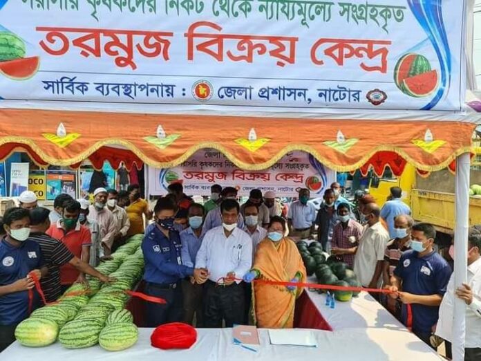 অসাধু ব্যবসায়ীদের দৌরাত্ম কমাতে শেষ পর্যন্ত তরমুজের ন্যায্যমূল্যের বিক্রয় কেন্দ্র করা হল দেশের কৃষি খামারের জন্য বিখ্যাত উত্তর বঙ্গের নাটোরে। আজ রবিবার ২ মে নাটোর জেলা প্রশাসনের পক্ষ হতে সরাসরি কৃষকদের নিকট থেকে ন্যায্যমূল্যে সংগ্রহকৃত এই তরমুজ বিক্রয় কেন্দ্রের উদ্বোধন করেন জেলা প্রশাসক মোঃ শাহরিয়াজ, পিএএ। এসময় আরো উপস্থিত ছিলেন পুলিশ সুপার, কৃষি সম্প্রসারণ অধিদপ্তর এর উপ- পরিচালক ও নাটোর পৌরসভার মেয়র। জেলা প্রশাসনের এই উদ্যোগকে স্বাগত জানিয়েছেন নাটোরের বিভিন্ন কমিউনিটির লোক ও সাধারণ মানুষ। কয়েকজন স্থানীয় অধিবাসী বলেন, এখানে কিছু অসাধু ব্যবসায়ী সুযোগ পেলেই শুরু করে ইচ্ছেমত দাম হাঁকিয়ে কৃষি পণ্য বেচাকেনা। মাঠ থেকে কৃষকদের কাছ থেকে অল্প দামে এনে তা বাজারে বিক্রি করে চড়া দামে। এমনকি এই পবিত্র রমজান মাসেও বিবেক বুদ্ধি বিসর্জন দিয়ে তারা করে চলেছে এমন গর্হিত কাজ কারবার। বশির আহমেদ নামে একজন স্থানীয় অধিবাসী বলেন, কৃষকদের কাছ থেকে পাইকারী দামে শত বা হাজার হিসেবে তরমুজ কিনে কিছু অসাধু ব্যবসায়ী তা বাজারে বিক্রি করছে কেজি হিসেবে। এমনও দেখা গেছে, প্রতি পিস তরমুজ ৩০ টাকা দামে কৃষকদের কাছ থেকে কিনে তারা বাজারে খুচরা বিক্রি করছে কেজি ৩০ টাকা দামে। সেই হিসেবে সেই ৩০ টাকা দামের তরমুজটি একজন সাধারণ ক্রেতাকে ওজনে কিনতে হচ্ছে প্রায় ২০০ থেকে ৩০০ টাকা দামে। এটা একধরনের ডাকাতি। আফসার উদ্দিন নামে আরেকজন বলেন, ব্যবসায়ীরা অবশ্যই লাভ করবে।কিন্তু তাই বলে এমন ডাকাতি ব্যবসা মেনে নেওয়া যায় না। এটা বেআইনী ও ক্রেতা স্বার্থ বিরোধী। জেলা প্রশাসনের উদ্যোগে তরমুজের ন্যায্য মূল্যের বিক্রয় কেন্দ্র করাতে স্থানীয় কৃষকও লাভবান হবেন এবং ক্রেতা সাধারণও উপকৃত হবেন।
