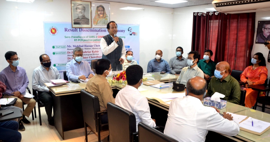 শিক্ষা উপমন্ত্রী ও ২৫০ শয্যা বিশিষ্ট জেনারেল হাসপাতালের ব্যবস্থাপনা কমিটির সভাপতি ব্যারিস্টার মহিবুল হাসান চৌধুরী নওফেল এমপি বলেছেন, দেশে করোনা ভাইরাস আসার পর চট্টগ্রামে কোভিড-১৯ আক্রান্ত রোগীদের জন্য সর্বপ্রথম একমাত্র ভরসাস্থল ছিল চট্টগ্রাম ২৫০ শয্যা বিশিষ্ট আন্দরকিল্লা জেনারেল হাসপাতাল। প্রথমাবস্থায় কোভিড আক্রান্ত রোগীদের চিকিৎসার জন্য এ হাসপাতালে প্রয়োজনীয় চিকিৎসা সরঞ্জামের সংকট থাকলেও বর্তমানে পরিপূর্ণ। চট্টগ্রামে কোভিড-১৯ আক্রান্ত রোগীদের শরীরে এন্টিবডির উপস্থিতি সংক্রান্তে জেনারেল হাসপাতালে গবেষণা কার্যক্রম দেশে এই প্রথম। অত্যন্ত দক্ষতার সাথে কোভিড রোগীদের শরীরে এন্টিবডির বিষয়ে সংশ্লিষ্ট চিকিৎসকগণের ক্রস বিভাগীয় গবেষণাটি সত্যিই প্রশংসার দাবীদার। এন্টিবডি গবেষণায় ভবিষ্যতে চট্টগ্রাম আরও অনেকদূর এগিয়ে যাবে। আজ ৮ মে ২০২১ ইংরেজি শনিবার দুপুরে জেনারেল হাসপাতালের কনফারেন্স রুমে আয়োজিত কোভিড-১৯ আক্রান্ত রোগীর শরীরে এন্টিবডির উপস্থিতি সংক্রান্ত সেরো-প্রিভ্যালেন্স ক্রস বিভাগীয় গবেষণা ফলাফল প্রকাশ অনুষ্ঠানে প্রধান অতিথির বক্তব্যে তিনি এসব কথা বলেন। চট্টগ্রাম জেলা সিভিল সার্জন ও ২৫০ শয্যা বিশিষ্ট জেনারেল হাসপাতালের তত্ত¡াবধায়ক ডা. সেখ ফজলে রাব্বির সভাপতিত্বে ও জুনিয়র কনসালট্যান্ট (মেডিসিন) ডা. এইচ এম হামিদুল্লাহ মেহেদীর সঞ্চালনায় অনুষ্ঠিত এন্টিবডি গবেষণা ফলাফল প্রকাশ অনুষ্ঠানে বিশেষ অতিথি ছিলেন বিভাগীয় পরিচালক (স্বাস্থ্য) ডা. হাসান শাহরিয়ার কবীর ও বিএমএ সভাপতি অধ্যাপক ডা. মুজিবুল হক খান। মূল প্রবন্ধ উপস্থাপন করেন ডেপুটি সিভিল সার্জন ডা. মোহাম্মদ আসিফ খান। আলোচনায় অংশ নেন চট্টগ্রাম জেনারেল হাসপাতালের সিনিয়র কনসালট্যান্ট (মেডিসিন) ও করোনা ফোকাল পার্সন ডাঃ মোঃ আব্দুর রব, সহকারী সার্জন ডাঃ অমি দেব ও সিনিয়র পুষ্টি কর্মকর্তা ডাঃ মোরতাহিনা রশিদ।