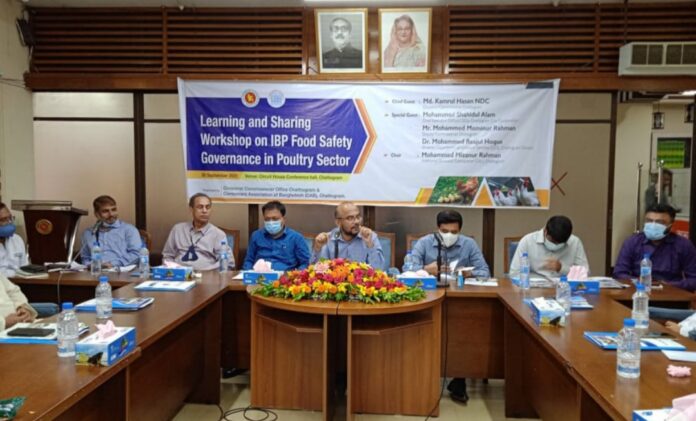 ৩০ সেপ্টেম্বর ২০২১ইং নগরীর চট্টগ্রাম সার্কিট হাউজ সম্মেলন কক্ষে অনুষ্ঠিত লার্নিং শেয়ারিং ওয়ার্কশপ অন ফুড সেফটি গর্ভানেন্স ইন পোল্ট্রি সেক্টর এ উপরোক্ত মতামত ব্যক্ত করা হয়। চট্টগ্রামের অতিরিক্ত বিভাগীয় কমিশনার(উন্নয়ন) মোহাম্মদ মিজানুর রহমানের সভাপতিত্বে অনুষ্ঠিত কর্মশালায় বিশেষ অতিথি ছিলেন চট্টগ্রামের জেলা প্রশাসক মোহাম্মদ মমিনুর রহমান, চট্টগ্রাম সিটি করপোরেশনের প্রধান কর্মকর্তা মোহাম্মদ নজরুল ইসলাম, বিভাগীয় প্রাণিসম্পদ কার্যালয়ের পরিচালক ডাঃ মোহাম্মদ রেয়াজুল হক জসিম, অতিরিক্ত জেলা প্রশাসক আসম জামশেদ খন্দকার, জাতীয় ভোক্তা অধিকার সংরক্ষন অধিদপ্তরের বিভাগীয় উপ-পরিচালক মোহাম্মদ ফয়েজ উল্যাহ, চট্টগ্রাম চেম্বারের সাবেক পরিচালক মাহফুজুল হক শাহ।