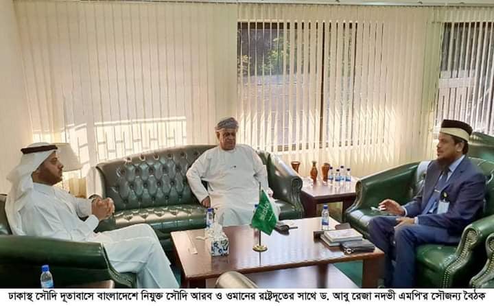 বাংলাদেশে নিযুক্ত সৌদি আরবের রাষ্ট্রদূত ঈসা বিন ইউসুফ আল দুহাইলান ও ওমানের রাষ্ট্রদূত ওমানের রাষ্ট্রদূত তাইয়্যিব সেলিম আল আলাভি এর সাথে আজ ৯ নভেম্বর সোমবার বিকেল তিনটায় এক সৌজন্য বৈঠকে মিলিত হন চট্টগ্রাম-১৫ সাতকানিয়া-লোহাগাড়া আসনের মাননীয় সংসদ সদস্য প্রফেসর ড.আবু রেজা মুহাম্মদ নেজামুদ্দিন নদভী। ঢাকাস্থ সৌদি দূতাবাসে এই সৌজন্য বৈঠক অনুষ্ঠিত হয়। বাংলাদেশের বিপুল জনশক্তি নির্ভর মধ্যপ্রাচ্যের গুরুত্বপূর্ণ এই দুই দেশের রাষ্ট্রদূতের সাথে ড.আবু রেজা মুহাম্মদ নেজামুদ্দিন নদভী এমপি’র সাথে বাংলাদেশের দ্বিপাক্ষিক স্বার্থ সংশ্লিষ্ট বিষয়াদি ছাড়াও আরব বিশ্ব এবং মুসলিম বিশ্বে চলমান বিভিন্ন বিষয় নিয়ে দীর্ঘক্ষণ আলাচনা করা হয়। সৌদি আরব ও ওমানের রাষ্ট্রদূতদ্বয় মাননীয় প্রধানমন্ত্রী শেখ হাসিনার গতিশীল নেতৃত্বে বাংলাদেশের ক্রমবর্ধমান উন্নয়নের ভূঁয়সী প্রশংসা করে বলেন, মধ্যপ্রাচ্যের বিভিন্ন ইস্যুতে বাংলাদেশের ইতিবাচক ভূমিকা সৌদি আরব ও ওমান সরকার অত্যন্ত গুরুত্বের সাথে বিবেচনায় নেয় এবং বাংলাদেশের যেকোন স্বার্থ সংশ্লিষ্ট বিষয়কে সৌদি আরব ও ওমান সরকার সবসময় অগ্রাধিকার দিয়ে থাকে।