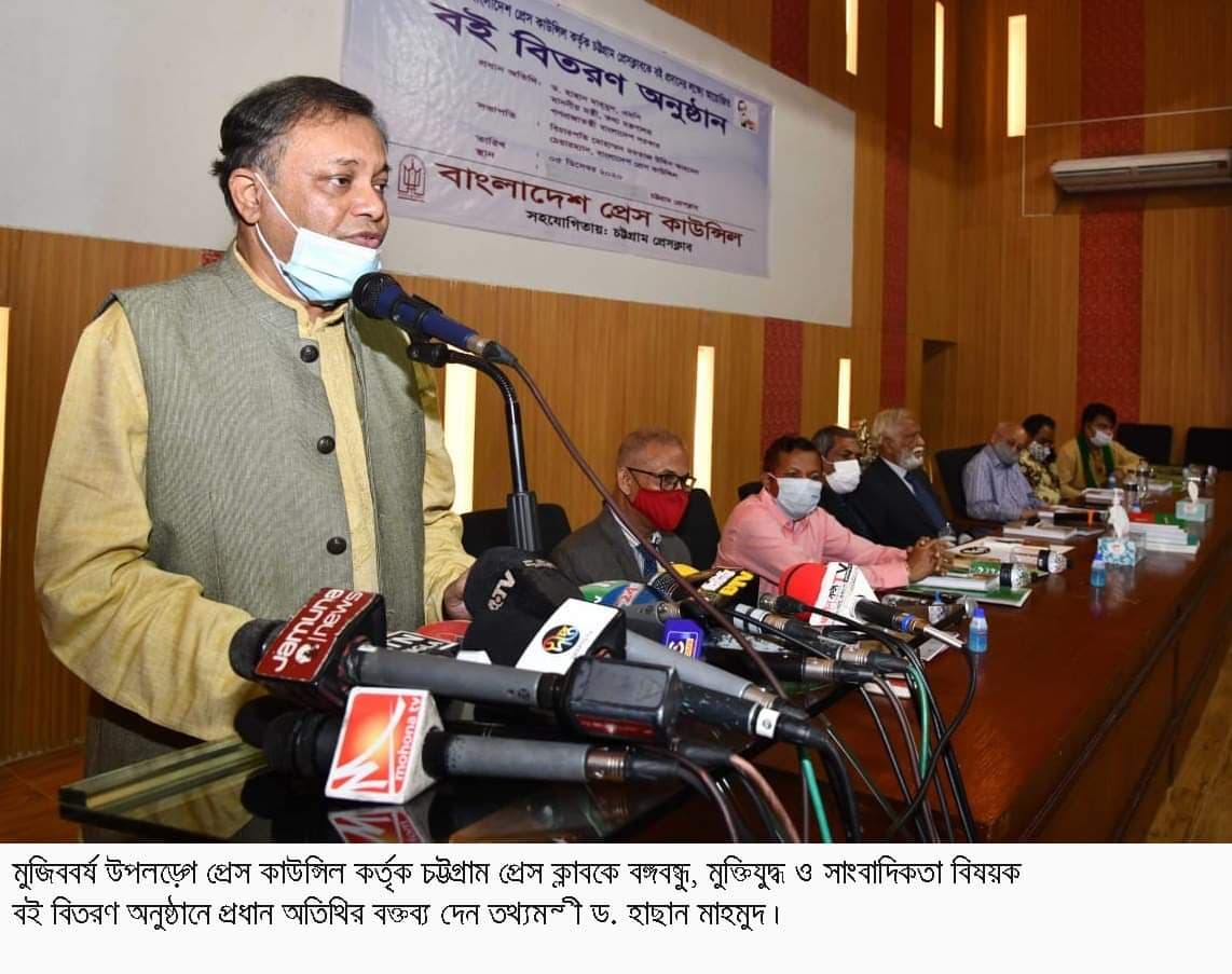 তথ্যমন্ত্রী ড. হাছান মাহমুদ বলেছেন, মুজিববর্ষ আমরা যেভাবে পালন করতে চেয়েছিলাম করোনার কারণে সেভাবে পালন করতে পারছি না। মুজিববর্ষের শেষের দিকে এসে আজকে নানাভাবে নানা প্রসঙ্গ টেনে এনে বিতর্ক তৈরি করার অপচেষ্টা চালানো হচ্ছে। একটি অসৎ উদ্দেশ্য নিয়ে আজকে নানা প্রসঙ্গ টেনে সমাজে অস্থিরতা তৈরি করার অপচেষ্টা হচ্ছে, আমাদের এ ব্যাপারে সতর্ক থাকতে হবে। কোনভাবেই কোন ইস্যুতে বঙ্গবন্ধুর অবমাননা সহ্য করা হবে না। শনিবার (৫ ডিসেম্বর) দুপুরে মুজিববর্ষ উপলক্ষে বাংলাদেশ প্রেস কাউন্সিল কর্তৃক বঙ্গবন্ধু, মুক্তিযুদ্ধ ও সাংবাদিকতা বিষয়ক চট্টগ্রাম প্রেস ক্লাবকে বই বিতরণ অনুষ্ঠানে প্রধান অতিথির বক্তব্যে তিনি এসব কথা বলেন। চট্টগ্রাম প্রেস ক্লাবের বঙ্গবন্ধু হলে এ অনুষ্ঠানে সভাপতিত্ব করেন প্রেস কাউন্সিলের চেয়ারম্যান বিচারপতি মোহাম্মদ মমতাজ উদ্দিন আহমেদ। এতে বিশেষ অতিথির বক্তব্য রাখেন প্রেস কাউন্সিলের সদস্য ও দৈনিক আজাদী সম্পাদক এমএ মালেক, প্রেস কাউন্সিলের সদস্য ও বিএফইউজে’র যুগ্ন মহাসচিব এমএ মজিদ, বিএফইউজে’র সহ-সভাপতি রিয়াজ হায়দার চৌধুরী, চট্টগ্রাম প্রেস ক্লাবের ভারপ্রাপ্ত সভাপতি সালাউদ্দিন মো. রেজা, ও সাধারণ সম্পাদক চৌধুরী ফরিদ। নানা ইস্যু তৈরি করে যারা বঙ্গবন্ধুকে অবমাননা ও সমাজে হানাহানি তৈরি করতে চায় তাদের বিরুদ্ধে সাংবাদিকদের সোচ্চার হবার অনুরোধ জানিয়ে ড. হাছান মাহমুদ বলেন, সাংবাদিকরা দেশের মানুষকে পথ দেখায়, আমাদের স্বাধিকার আদায়ের আন্দোলনে যেমন সাংবাদিকদের অন্যন্য ভূমিকা ছিল, ঠিক একইসাথে স্বাধীনতা সংগ্রামেও সাংবাদিকদের অনবদ্য ভূমিকা ছিল। বঙ্গবন্ধুর নেতৃত্বে স্বাধীনতার জন্য সাংবাদিকদের লেখনি, পত্রিকার সংবাদ মানুষের মনন তৈরী করার ক্ষেত্রে গুরুত্বপূর্ণ ভুমিকা রেখেছেন। যারা সমাজকে পিছিয়ে দিতে চায়, যারা মধ্যযুগের সমাজ ব্যবস্থা কায়েম করতে চায়, তাদেরকে যারা পৃষ্ঠপোষকতা করে, তাদের বিরুদ্ধেও আজ কলম নিয়ে সোচ্চার হবার সময় এসেছে, বলেন তথ্যমন্ত্রী। আওয়ামী লীগের যুগ্ন সাধারণ সম্পাদক হাছান মাহমুদ বলেন, বঙ্গবন্ধু একটি নিরস্ত্র ও ঘুমন্ত জাতিকে স্বাধীনতার মূলমন্ত্রে উজ্জীবিত করেছেন। হাজার হাজার বছরের ইতিহাসে বাঙালি জাতিসত্ত্বা সৃষ্টি হবার পর বাঙালি কখনো স্বাধীন ছিল না। বাঙালি সার্বিকভাবে কখনো নিজেদের শাসন করতে পারেনি। বাংলা ভাষাবাসী অঞ্চলে বিভিন্ন সময়ে কিছু স্বাধীন রাজা ছিলেন, কিন্তু পুরো বাংলা ভাষাভাষি অঞ্চল নিয়ে পুরো স্বাধীন রাজ্য কখনো ছিল না। তিনি বলেন, আমরা বাংলার শেষ স্বাধীন নবাব সিরাজউদ্দৌল্লার কথা বলি। তিনি বাংলার শেষ স্বাধীন নবাব ছিলেন, তবে তিনি চলনে বলনে কথনে বাঙালি ছিলেন না, তার ও রাজ ভাষা ছিল ফার্সি, সৈন্যদের 