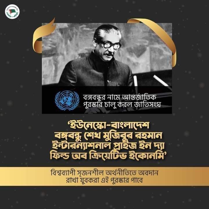 বঙ্গবন্ধু শেখ মুজিবুর রহমান ইন্টারন্যাশনাল প্রাইজ ইন দ্য ফিল্ড অব ক্রিয়েটিভ ইকোনমি’ নামে একটি আন্তর্জাতিক পুরস্কার প্রবর্তন করছে জাতিসংঘের অঙ্গ সংস্থা ইউনেস্কো। ভার্চ্যুয়ালি অনুষ্ঠিত ইউনেস্কোর ২১০তম নির্বাহী বোর্ড সভায় এই সিদ্ধান্ত গৃহীত হয়েছে । এ বিষয়ে পররাষ্ট্রমন্ত্রী ড. এ কে আব্দুল মোমেন রোববার (১৩ ডিসেম্বর) সাংবাদিকদের বলেন, জাতিসংঘের শিক্ষা, সংস্কৃতি ও বিজ্ঞান বিষয়ক সংস্থা ইউনেস্কো এই আন্তর্জাতিক পুরস্কার প্রবর্তনের সিদ্ধান্ত নিয়েছে। ১১ ডিসেম্বর ইউনেস্কো নির্বাহী পরিষদের শরৎকালীন অধিবেশনে সর্বসম্মতিক্রমে এই সিদ্ধান্ত গৃহীত হয়। ইউনেস্কো আন্তর্জাতিক পর্যায়ে খ্যাতিমান ব্যক্তি ও প্রতিষ্ঠানের নামে ২৩টি ইউনেস্কো আন্তর্জাতিক পুরস্কার প্রবর্তন করেছে। এবার বাংলাদেশের সর্বজন শ্রদ্ধেয় ব্যক্তিত্ব বঙ্গবন্ধুর নামে ইউনেস্কো পুরস্কার প্রবর্তন করলো। ড. মোমেন আরো বলেন, এ পুরষ্কার সৃজনশীল অর্থনীতিতে যুবসমাজের উন্নয়নে সংস্কৃতিকর্মী, প্রতিষ্ঠান বা সংস্থা কর্তৃক গৃহীত ব্যতিক্রমধর্মী উদ্যোগকে স্বীকৃতি দেবে। জাতির পিতা বঙ্গবন্ধু শেখ মুজিবুর রহমান একজন দূরদর্শী চিন্তাবিদ ছিলেন। বাঙালি সংস্কৃতির বিকাশে তার অবদান অনস্বীকার্য। ১৯৫২ এর ভাষা আন্দোলনে তার অংশগ্রহণ, বাক-স্বাধীনতার বিকাশে তার সংগ্রাম, স্বাধীনতার পর বাঙালি সংস্কৃতি চর্চার সুযোগ সৃষ্টিতে বিভিন্ন প্রতিষ্ঠান স্থাপন জাতি কৃতজ্ঞতার সাথে স্মরণ করে। স্বাধীনতার পরই বাংলাদেশ শিল্পকলা একাডেমি এবং বাংলাদেশ লোক ও কারু শিল্প ফাউন্ডেশন প্রতিষ্ঠা সৃজনশীল অর্থনীতির ক্ষেত্রে বঙ্গবন্ধুর অবদানের উজ্জ্বল দৃষ্টান্ত। বঙ্গবন্ধুর জন্মশতবার্ষিকী উদযাপন উপলক্ষ্যে বঙ্গবন্ধুর জীবনাদর্শনের আন্তর্জাতিকীকরণ এবং তার আদর্শ বিশ্বময় ছড়িয়ে দেওয়ার জন্য ইউনেস্কোর এই আন্তর্জাতিক পুরস্কার প্রবর্তন খুবই সময়োপযোগী। তিনি বলেন, বাংলাদেশ সরকারের ইউনেস্কোর প্রতি অঙ্গীকারের কথা বিবেচনায় নিয়ে ইউনেস্কো বঙ্গবন্ধুর নামে পুরস্কার প্রবর্তনে সম্মতি দেয়। ইউনেস্কোর মতো জাতিসংঘের একটি অঙ্গসংস্থা কর্তৃক প্রবর্তিত এ পুরস্কার বঙ্গবন্ধুর জীবনাদর্শ বিশ্বময় ছড়িয়ে দেওয়ার সুযোগ তৈরি করবে ও বিশ্বময় সংস্কৃতিকর্মীদের সৃজনশীল অর্থনীতির বিকাশে অনুপ্রেরণা যোগাবে। বাংলাদেশ ও বঙ্গবন্ধু যে এক ও অভিন্ন তা পুরস্কারের শিরোনামে প্রস্ফুটিত হয়েছে। এ পুরস্কার বাংলাদেশের ব্র্যান্ডিং ও ইমেজ বিল্ডিং-এ বিশেষ ভূমিকা রাখবে। জানা যায়, প্রতি দুই বছর অন্তর এই পুরস্কার দেওয়া হবে, যার অর্থমান ৫০ হাজার মার্কিন ডলার। পুরস্কারটি প্রথমবারের মতো ২০২১ সালের নভেম্বরে অনুষ্ঠিতব্য ইউনেস্কোর ৪১তম সা