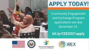 আমেরিকা যুক্তরাষ্ট্র সরকারের অর্থায়নে সুশীল সামাজিক নেতৃত্ব বিকাশকল্পে একটি নতুন কার্যক্রম- কমিউনিটি এনগেজমেন্ট এক্সচেঞ্জ (সিইই) প্রোগ্রামের জন্য আবেদন আহ্বান করেছে ঢাকাস্থ আমেরিকান দূতাবাস। এক বছরের এই রূপান্তরমূলক নেতৃত্ব বিকাশ কার্যক্রমটি ১০০টিরও বেশি দেশের বিভিন্ন জনগোষ্ঠীর(কমিউনিটি) ২০ থেকে ২৭ বছর বয়সী সুশীল সমাজ নেতৃবৃন্দের জন্য পরিকল্পনা করা হয়েছে। এর মাধ্যমে তারা নেটওয়ার্ক, সম্পর্ক এবং জনকল্যাণে তথ্য ব্যবহারের শক্তিকে কাজে লাগিয়ে নাগরিক সংলাপ ও শান্তিস্থাপন, মুক্ত ও অংশগ্রহণমূলক সরকার, নারী ও জেন্ডার, অভিযোজন সক্ষমতা ও টেকসই উন্নয়ন এবং যুবসমাজের সক্রিয়তাসহ একুশ শতকের বিভিন্ন জরুরী সমস্যা নিরসনে সক্ষম হবে। এ কার্যক্রমের আওতায় পূর্ণ অর্থায়নে যুক্তরাষ্ট্রের একটি সুশীল সমাজ প্রতিষ্ঠানে তিন-মাসব্যাপী হাতে-কলমে অনুশীলনের সুযোগ রয়েছে। আবেদনের শেষ তারিখ: ২৩ ডিসেম্বর ২০২০, বুধবার রাত ১১:৫৯ মিনিট (ইস্টার্ন স্ট্যান্ডার্ড টাইম) অর্থাৎ ২৪ ডিসেম্বর ২০২০, বৃহস্পতিবার সকাল ১০:৫৯ মিনিট (বাংলাদেশ সময়)। এই কার্যক্রমের লক্ষ্য হলো নেতৃত্বের বৃহত্তর ভূমিকা অনুধাবন, সুশীল সমাজের সক্ষমতা বৃদ্ধি এবং সহযোগিতামূলক নেতৃত্ব প্রদানে অংশগ্রহণকারীদের সক্ষমতা বাড়ানোর মাধ্যমে বিশ্বব্যাপী সুশীল সমাজের জন্য উদ্ভাবনী পরিবেশ সৃষ্টিতে অংশগ্রহণকারী (“ফেলোদের”) ক্ষমতায়ন। পূর্ণ অর্থায়নে যুক্তরাষ্ট্রে তিন মাসের হাতে-কলমে অনুশীলনের বাইরে এই কার্যক্রমের আওতায় রয়েছে নেতৃত্ব ও সামাজিক সক্রিয়তা, সেবা বিষয়ে শেখার সুযোগ, পরামর্শদান এবং ফেলোদের নিজ নিজ দেশে উন্নয়নমূলক প্রকল্প বাস্তবায়ন বিষয়ে অনলাইন ও মুখোমুখী প্রশিক্ষণ। ঢাকাস্থ আমেরিকান দূতাবাস সূত্রে জানা যায়, কমিউনিটি এনগেজমেন্ট এক্সচেঞ্জ (সিইই) একটি মেধা-ভিত্তিক কার্যক্রম। কয়েকটি শর্তাবলী পূরণ সাপেক্ষে কার্যক্রমটি বাংলাদেশ ও অন্যান্য দেশের সম্ভাবনাময় নাগরিক ও সুশীল সমাজ নেতৃবৃন্দের জন্য উন্মুক্ত। যোগ্যতার শর্তাবলী পূরণ করে না এমন আবেদনগুলো অযোগ্য বিবেচিত হবে এবং বাছাই কমিটি কর্তৃক পর্যালোচনা করা হবে না। শর্তাবলী হলো, ১ নভেম্বর ২০২০ তারিখে বয়স ২০ থেকে ২৭ বছরের মধ্যে। বাংলাদেশী নাগরিক। আপনার নিজ দেশে বসবাসরত ও কর্মরত। নিজ সম্প্রদায়ের পক্ষে কর্মরত উদ্বাস্তু অবস্থাপ্রাপ্ত ব্যক্তিদের জন্য বিশেষ বিবেচনা নেয়া যেতে পারে। আপনার নিজ দেশের সুশীল সমাজকে সহায়তা দিতে পেশাজীবন গড়ার লক্ষ্যে জনসমাজের অংশগ্রহণে পরিচালিত উদ্যোগে পেশাজীবী অথবা স্বেচ্ছাসেবী হিসাবে কর্মরত। আবেদনকালে ইংরেজিতে কথা বলা ও লেখার উচ্চ সক্ষমতা। অক্টোবর ২০২১ থেকে জানুয়ারি ২০২২-এর মধ্যে তিন 