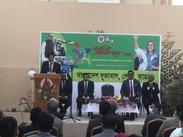 যথাযোগ্য মর্যাদায় বাংলাদেশ দূতাবাস, দোহা, কাতার কর্তৃক আন্তর্জাতিক অভিবাসী দিবস ২০২০ উদযাপন করা হয়। করোনার প্রাদুর্ভাব থাকায় এ সম্পর্কিত কাতার সরকারের স্বাস্থ্যবিধি মেনেই দিবসটি উদযাপন করা হয়। ১৯ ডিসেম্বর বাংলাদেশ দূতাবাসের কাউন্সেলর (পাসপোর্ট ও ভিসা) মোঃ নাজমুল হাসান এর সঞ্চালনায় পবিত্র কুরআন থেকে তিলাওয়াতের মাধ্যমে দিবসটির কার্যক্রম শুরু হয়। এ উপলক্ষ্যে প্রবাসী কল্যাণ ও কর্মসংস্থান মন্ত্রণালয়ের সচিব, প্রবাসী কল্যাণ ও কর্মসংস্থান মন্ত্রী, পররাষ্ট্র মন্ত্রী, প্রধান মন্ত্রী ও রাষ্ট্রপতি কর্তৃক প্রদত্ত বানী পাঠ করে শুনানো হয়। এরপর দূতাবাসের কাউন্সেলর (শ্রম) ড. মুহাম্মদ মুস্তাফিজুর রহমান দূতাবাসের কল্যাণমূলক কার্যাবলী ও কর্মী সচেতনতামূলক বিষয়ে শিরোনামে একটি পাওয়ার পয়েন্ট প্রেজেন্টেশন করেন। উপস্থাপনায় বঙ্গবন্ধুর অভিবাসন দর্শন, মধ্যপ্রাচ্যের দেশগুলোর সাথে সুসম্পর্ক স্থাপন, দ্বিপাক্ষিক সম্পর্কের উন্নয়ন এবং অভিবাসন সম্পর্কিত আন্তর্জাতিক নীতি ও পদ্ধতির প্রতি সমর্থনের বিষয়ে আলোচনা করা হয়। এছাড়া বাংলাদেশ দূতাবাস কর্তৃক কল্যাণমূলক কার্যাবলী ও কর্মী সচেতনতামূলক বিষয়ে উপস্থাপনা পেশ করা হয় । দিবসটি উপলক্ষে প্রথমবারের মতো ০৩টি ক্যাটাগরিতে বৈধপথে রেমিটেন্স প্রেরণকারী ৭ জন প্রবাসীকে ক্রেস্ট ও সম্মাননা পত্র প্রদান করা হয়। পুরস্কৃতগণ হলেন- আনজুমান আকতার, শেখ মোহাম্মদ আহাদুল ইসলাম, মোঃ আবদুল কাদের, মোঃ মজাহারুল ইসলাম, মোহাম্মাদ হেদায়েত উল্লাহ কবীর, মোহাম্মদ এনামুল হক চৌধুরী ও মোহাম্মদ আজিজুল হক রাসেল। পুরস্কার প্রাপ্তগণের মধ্যে ০২ জন তাঁদের অনুভূতি প্রকাশ করেন। কাতারে প্রথমবারের মতো এ ধরনের সম্মাণনা প্রদানের জন্য তাঁরা দূতাবাসের প্রতি কতৃজ্ঞতা ও ধন্যবাদ জ্ঞাপন করেন। রাষ্ট্রদূত মোঃ জসীম উদ্দিন, এনডিসি দিবসটির তাৎপর্য তুলে ধরে তাঁর বক্তব্যে বিজয়ের মাসে জাতির পিতা বঙ্গবন্ধু শেখ মুজিবুর রহমান, জাতীয় চার নেতা, ৩০ লক্ষ শহীদ ও ০২ লক্ষ মা বোনের প্রতি গভীর শ্রদ্ধা জ্ঞাপন করেন। তিনি বলেন আন্তর্জাতিক অভিবাসী দিবস উপলক্ষ্যে “মুজিববর্ষের আহবান, দক্ষ হয়ে বিদেশ যান” যে স্লোগানটি নির্ধারণ করা হয়েছে তা অত্যন্ত প্রাসঙ্গিক। বর্তমানে পৃথিবীর ১৭০টি দেশে প্রায় ০১ কোটি ২০ লক্ষ বাংলাদেশী অভিবাসী কর্তৃক প্রেরিত রেমিট্যান্স বাংলাদেশের জিডিপিতে শতকরা ১২ ভাগ অবদান রাখছে। কাতারে ০৪ লক্ষ প্রবাসী বাংলাদেশী কর্তৃক প্রেরিত ০১ বিলিয়ন ডলার বাংলাদেশের মোট রেমিট্যান্সের ২০ ভাগের এক ভাগ বিধায় কাতার প্রবাসী সকল বাংলাদেশীকে সাধুবাদ জানান। বর্তমানে পাসপোর্ট সেবা প্রবাসীদের দোর গোড়ায় নেয়া হয়েছে এবং অনলাইন সেবা চালু হয