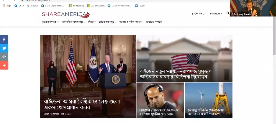 আন্তর্জাতিক মাতৃভাষা দিবস মহান ২১ ফেব্রুয়ারিকে সামনে রেখে ও বাংলাদেশের স্বাধীনতার ৫০ বছর পূর্তির সম্মানে @ShareAmerica ওয়েবসাইটের বাংলা সংস্করণ উদ্বোধন করা হয়েছে । বাংলাদেশে আমেরিকা যুক্তরাষ্ট্রের রাষ্ট্রদূত রাষ্ট্রদূত আর্ল আর মিলার। এই সময় তিনি বলেন, এই ওয়েবসাইটের মাধ্যমে বাংলাদেশী জনগণ যুক্তরাষ্ট্রের নীতি ও আমেরিকান মূল্যবোধ সম্পর্কে আরো ভালোভাবে জানতে পারবে। এছাড়াও ওয়েবসাইটটি বাংলাদেশের ইতিহাস ও সংস্কৃতির প্রতি যুক্তরাষ্ট্রের শ্রদ্ধার স্মারক হিসেবে কাজ করবে। আমরা আশা করি নতুন এই ওয়েবসাইটটি যুক্তরাষ্ট্রের বৈদেশিক নীতি ও গণতান্ত্রিক চর্চার প্রতি সমর্থন, সবার জন্য মানবাধিকার এবং আমেরিকান মূল্যবোধ ও সংস্কৃতির পক্ষে আইনের শাসন-সহ আরো অনেক বিষয়ে বাংলাদেশী ও আমেরিকানদের মধ্যে সমঝোতা আরো বাড়িয়ে তুলবে।