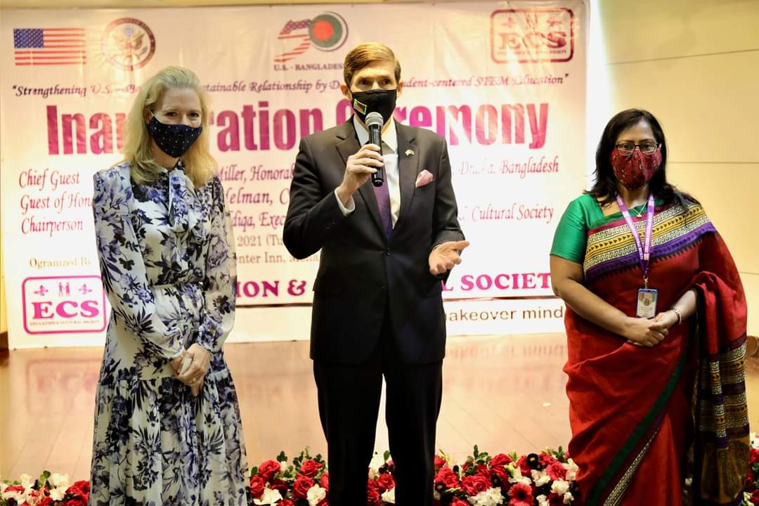 এ বিষয়ে রাষ্ট্রদূত মিলার বলেন “বাংলাদেশের স্বাধীনতার ৫০তম বার্ষিকীর প্রাক্কালে বৈজ্ঞানিক গবেষণা ও উদ্ভাবনাকে এগিয়ে নিতে অব্যাহতভাবে সকল বাধা-বিঘ্ন পেরিয়ে নারী ও মেয়েদের শিক্ষা ও পেশাগত উন্নয়নে বিনিয়োগের জন্য এখনই সর্বোত্তম সময়। তাঁরাই ভবিষ্যৎ নেতা নেতৃত্ব ও পরিবর্তনের কাণ্ডারি, যারা আমাদের বিশ্ব দেখার দৃষ্টিভঙ্গি বদলে দেবেন ও বৈশ্বিক সমস্যা সমাধান করবেন।” দূতাবাস অ্যাসাইটের সিইও মিশেল অ্যাডেলম্যান এই অনুপ্রেরণামূলক অনুষ্ঠানে যোগদানের জন্য স্টেট ডিপার্টমেন্টের এক্সচেঞ্জ কার্যক্রমের প্রাক্তন শিক্ষার্থী ( ILEP) নাসরিন সিদ্দিকা, ECS – Education & Cultural Society, ডা. হাসিনা খান ও ডা. এম শমসের আলী-কে ধন্যবাদ জানানো হয়। তথ্য সূত্রে জানা যায়, যুক্তরাষ্ট্র ও বাংলাদেশের জনগণের মধ্যে বন্ধুত্ব এবং শিক্ষা বিষয়ক সংযোগ জোরদার করার লক্ষ্যে গৃহীত “শিক্ষার্থীভিত্তিক STEM শিক্ষা বিকাশের মাধ্যমে যুক্তরাষ্ট্র-বাংলাদেশ টেকসই সম্পর্ক জোরদারকরণ” শীর্ষক প্রকল্পটি ঢাকাস্থ যুক্তরাষ্ট্র দূতাবাসের বহু উদ্যোগের অন্যতম। যুক্তরাষ্ট্রের বিশ্বসেরা কোন শিক্ষাপ্রতিষ্ঠানে STEM (বিজ্ঞান, প্রযুক্তি, প্রকৌশল ও গণিত) বিষয়ে পেশাজীবন গড়তে বা গবেষণা পরিচালনায় আগ্রহীরা আরো জানতে EducationUSA Bangladesh লিংকে যোগাযোগ করা যাবে বলে তথ্যসূত্রে জানানো হয়।